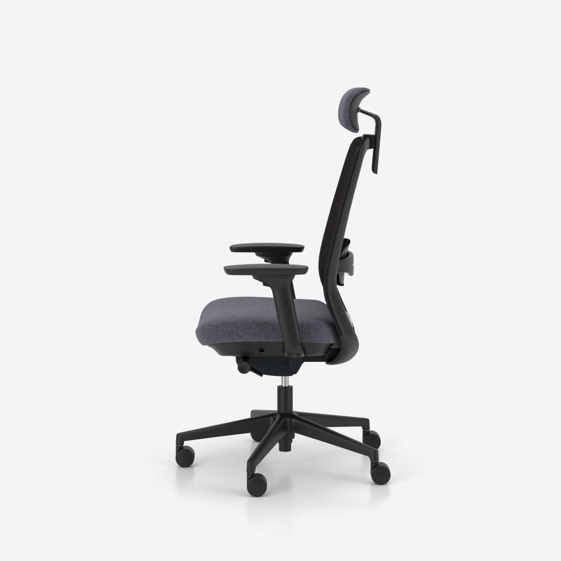 Oparcie wykonane z oddychającej siatki tapicerskiej na szkielecie z poliamidu wzmocnionego włóknem szklanym (PA+GF) zapewnia optymalną wentylację pleców. Siedzisko wypełnione jest pianką wylewną trudnopalną o grubości 75 mm i gęstości ok. 58 kg/m³ — gwarantuje to trwałość kształtu i komfort przez wiele lat użytkowania.